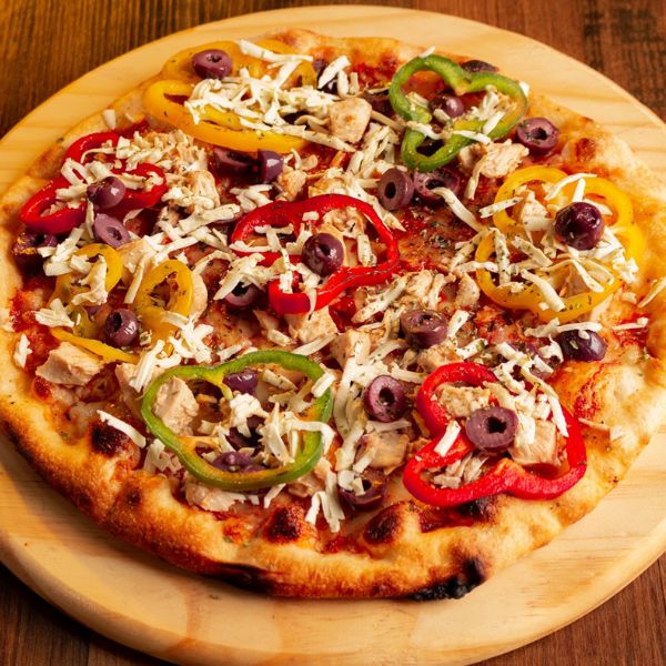 Salsa pomodoro, queso mozzarella, morrón ,pollo, aceitunas, queso de cabra, orégano